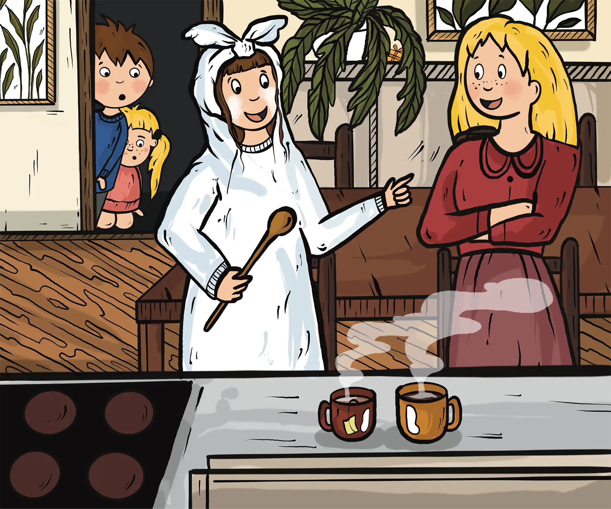 „No mamí, taky sis s ní nemusela dávat kafe,“ povídá káravě Šimon. „To teda,“ přisadila si Andulka, „leze nám tu po bytě a ty ji ještě hostíš.“ „Ále děti, vždyť to byla Lucka Novotná od vedle. Co bychom si spolu nemohly dát kávu? Je to fajn holka. Vy jste ji nepoznali?“ „A proč byla tak vymaškařená?“ ptaly se vykuleně děti. „To jsme se spolu domluvily, chtěla jsem, abyste poznali tu tradici, jak Lucky chodily dům od domu tak před sto lety a kontrolovaly, zda mají lidé uklizeno a připraveno na Vánoce. My už uklizeno máme. Dobrá tradice, ne?“ Děti nemohly říct ani ň. Mamka je pěkně vypekla.